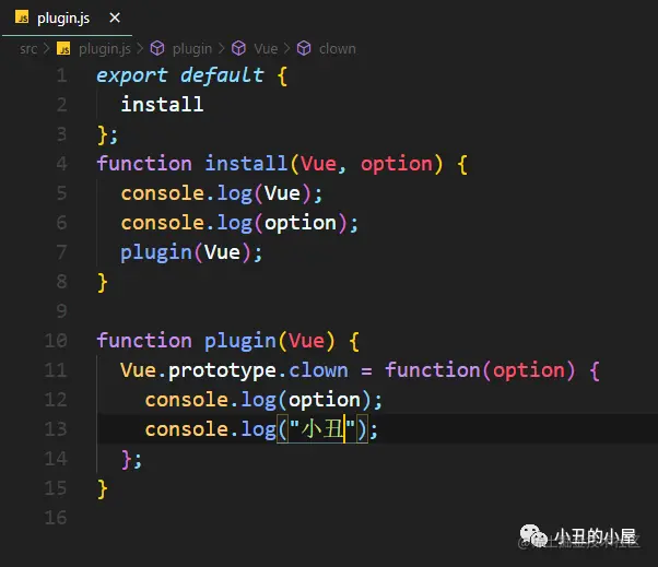 新建plugin.js文件,创建install方法,我们把clown方法挂在vue实例上。
