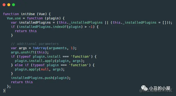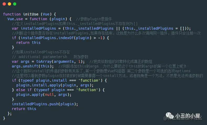 if (typeof plugin.install === 'function') { plugin.install.apply(plugin, args); } else if (typeof plugin === 'function') { plugin.apply(null, args); }这里可以看到参数plugin在封装的时候需要暴露一个install方法,或者自身是一个方法,不然是无法传递参数的