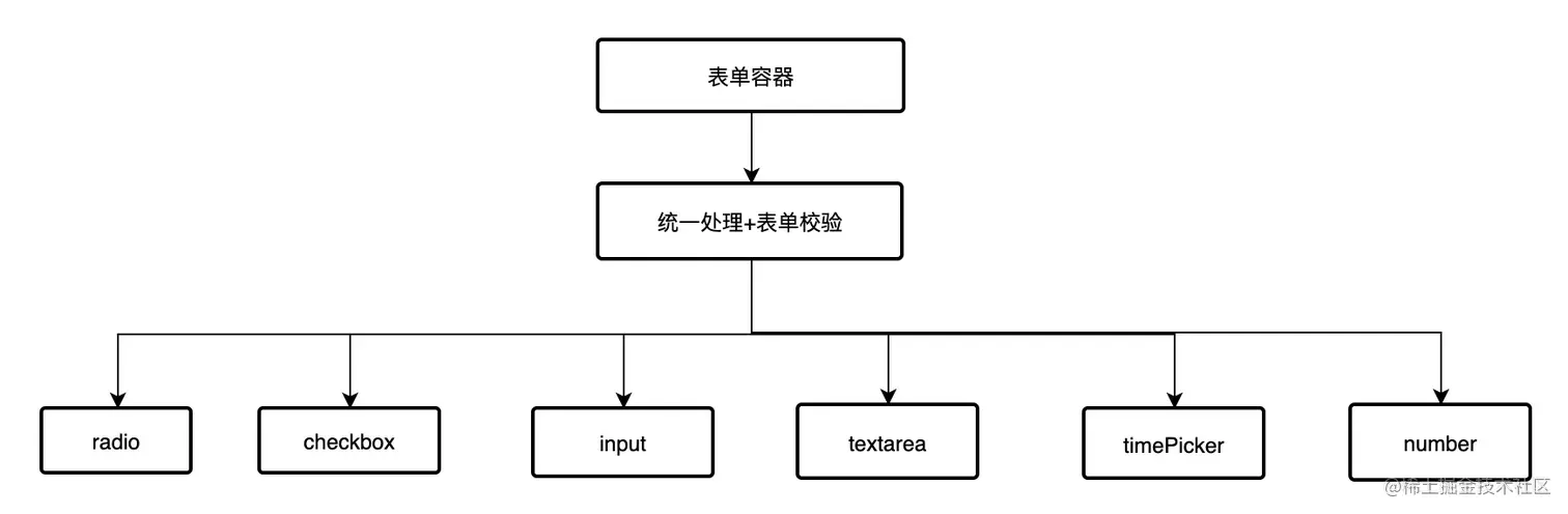所以在表单容器层和子控件层再添加一层吧。这一层的作用,就是把数据传递给每个子组件,并把子组件提交的答案进行统一的处理,以及最最最重要的表单校验。