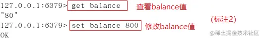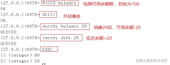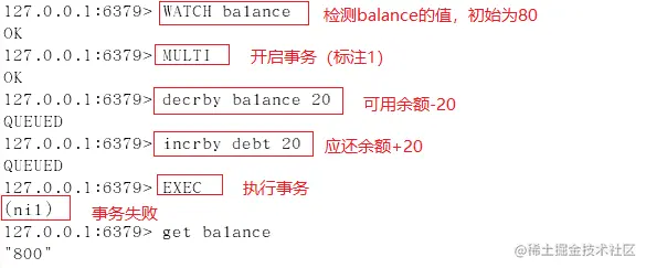 案例二:使用watch检测balance,在开启事务后(标注1处),在新窗口执行标注2中的操作,更改balance的值,模拟其他客户端在事务执行期间更改watch监控的数据,然后再执行标注1后命令,执行EXEC后,事务未成功执行。