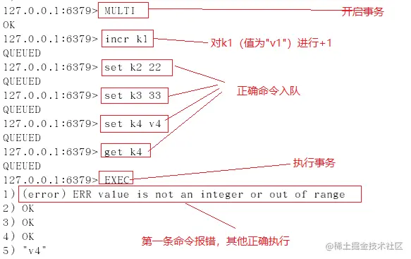 (4)若在事务队列中存在语法性错误(类似于java的1/0的运行时异常),则执行EXEC命令时,其他正确命令会被执行,错误命令抛出异常。