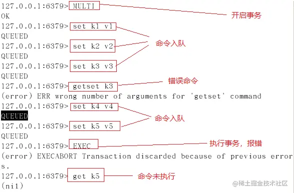 (3)若在事务队列中存在命令性错误(类似于java编译性错误),则执行EXEC命令时,所有命令都不会执行