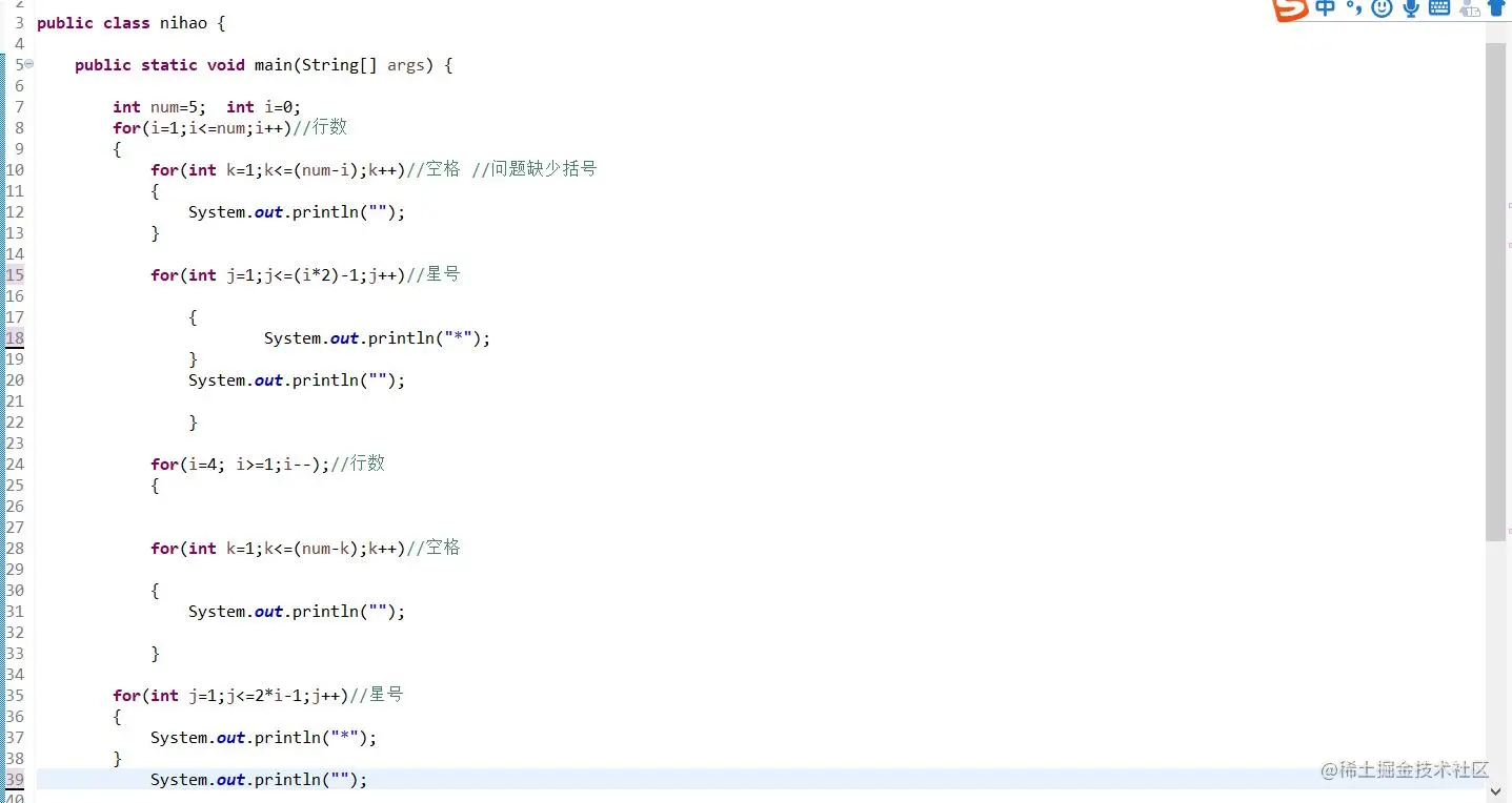 java菱形实心 ,为什么只能打印出上半部分,没有显示下半部分呢?