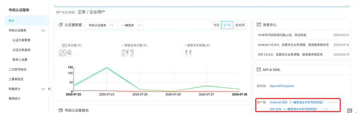 5、下载号码认证SDK并按照帮助文档中的开发指南或者所下载压缩包中的接口文档进行接入集成
