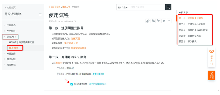 二、开通号码认证服务的2个前置条件?——1、完成注册阿里云账号;2、并完成企业实名认证 三、快速入门小技巧——点击“快速入门”可查看自助服务指引文档 开发者需要在APP中集成号码认证服务客户端SDK,并在服务端完成API对接。 1、一键登录的系统交互流程主要分为四个步骤: 第一步,号码认证SDK初始化 第二步,唤起授权页 第三步,同意授权并登录 第四步,发起取号 2、号码认证的系统交互流程主要分为三个步骤: 第一步,初始化 第二步,获取认证参数 第三步,发起认证
