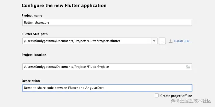 设置项目名称,例如:flutter_shareable并点击下一步。