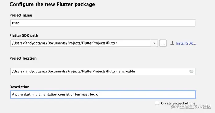 设置项目名称,如:core,并设置项目位置在flutter_shareable目录内,点击完成。