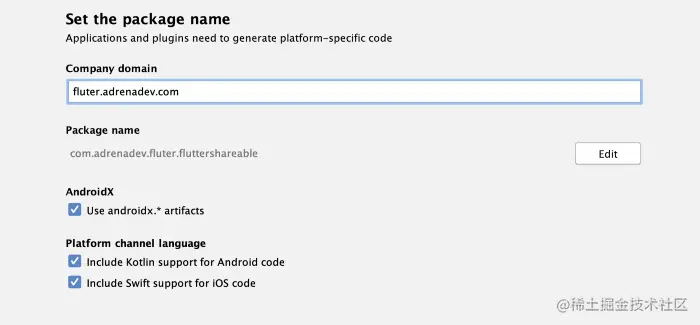 现在设置包名,勾选AndroidX、Kotlin支持和Swift支持,然后点击完成。