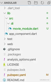 接下来,我们将通过Angular的依赖注入提供我们的ViewModel。创建一个名为src和di的新目录作为子目录,添加名为movie_module.dart的新文件。