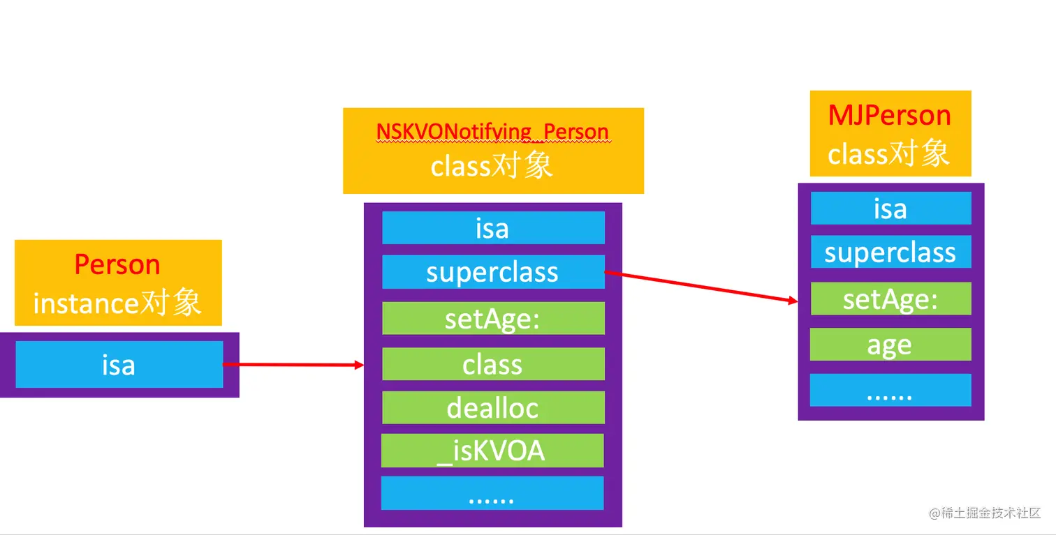 - 由于NSKVONotifying_Person是Class类型的对象,所以它内部肯定拥有isa指针和superClass指针,由此可以得到NSKVONotifying_Person的结构如下: