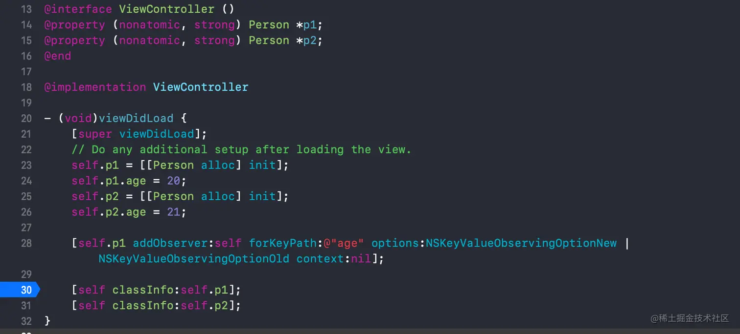 (lldb) po self.p1 <Person: 0x60000033c620>可以发现NSKVONotifying_Person会重写父类的class方法,原因是Apple不想让调用者知道NSKVONotifying_Person这个中间类的存在,所以重写class,返回原类的class对象,伪代码如下