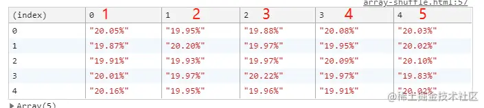 在Chrome浏览器上将[1, 2, 3, 4, 5]数组进行乱序10万次,计算乱序后每个值出现在各个位置的概率。测试代码如下: