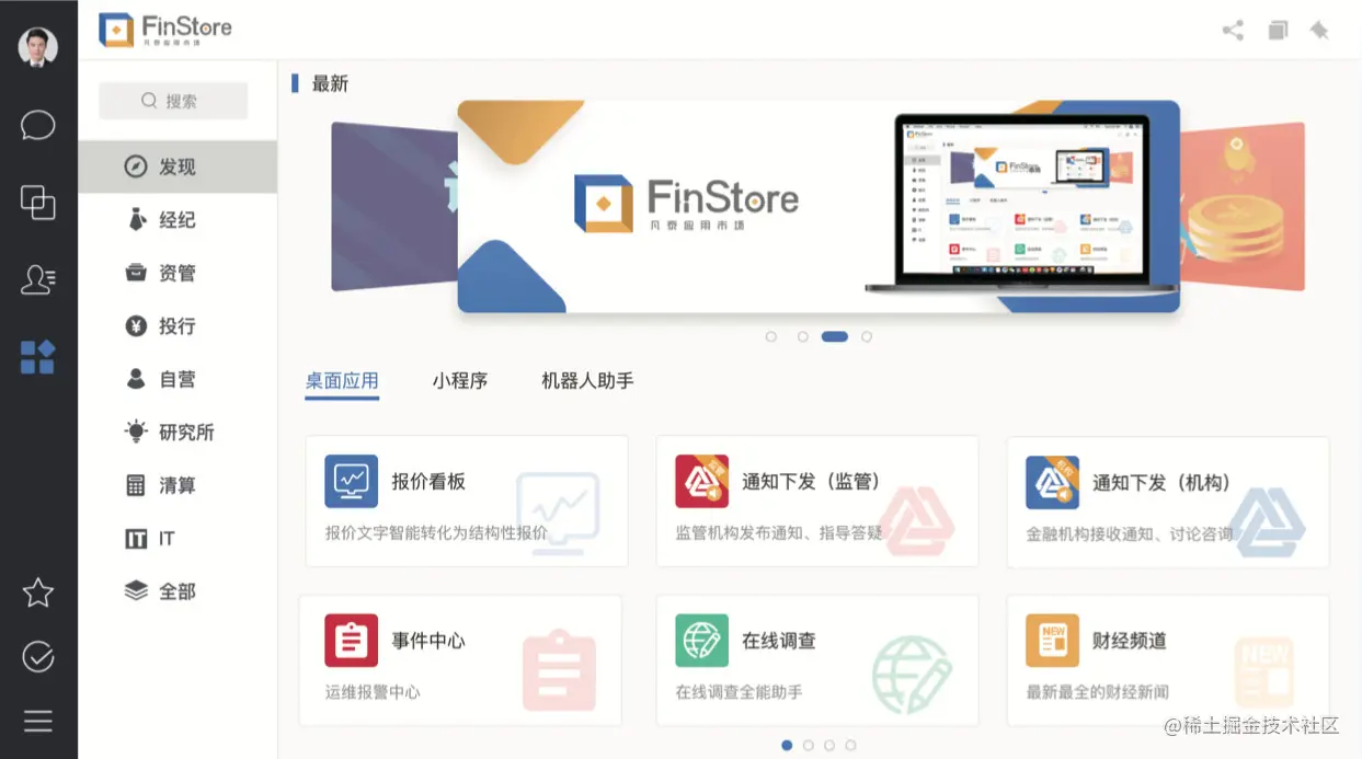 应用市场,金融机构内部往往会采购、自研不少的业务和协同工具,可以Finchat应用市场在Finchat 上架,当前支持的应用有小程序、机器人和网页应用。企业可以按照业务的需要,把相关业务模块搬到Finchat上来,或者作为一个快捷入口,与其他系统无缝连接。
