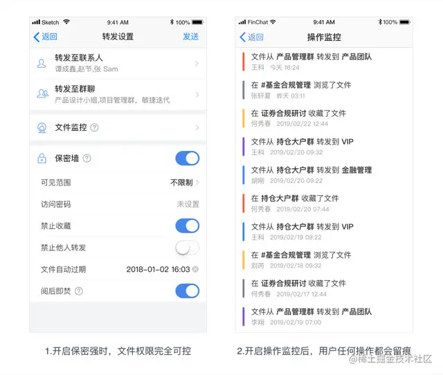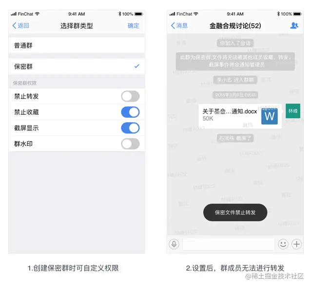 保密群、保密文件,可以为敏感的信息创建保密群聊,相关的聊天数据无法被转发、分享,截屏的时候会出现水印,确保聊天会话安全。而对于一些敏感文件,可以开启保密文件能力,可以为文件设置访问密码、过期时间、访问留痕等等,让文件即便转发出去,也可以受控查看、转播。