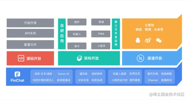 金融机构具有业务复杂、覆盖地区广、人员组成多等特点,如果只是提供一个标准化、封闭的工具,无法满足金融行业的特殊需要。基于此 1)Finchat开放了大量的API接口,目前已经开放了200多个API,从通讯录的管理到会话创建删除等等都提供了相应的接口。2)同时为了更好的适配各项业务,Ficnhat推出了自研的全套机器人开发工具链,诸如通知、订阅、告警等等场景,都可以通过配置相应的机器人轻松实现。3) 提供标准化SDK和配置能力,可以按照业务需要进行简单的配置,就可以把即时通讯能力嵌入到已有的应用中。4)开源能力,除了部分底层通讯层,其他部分前端代码都可以开源,进一步的减少的开发者的使用门槛和工作量。