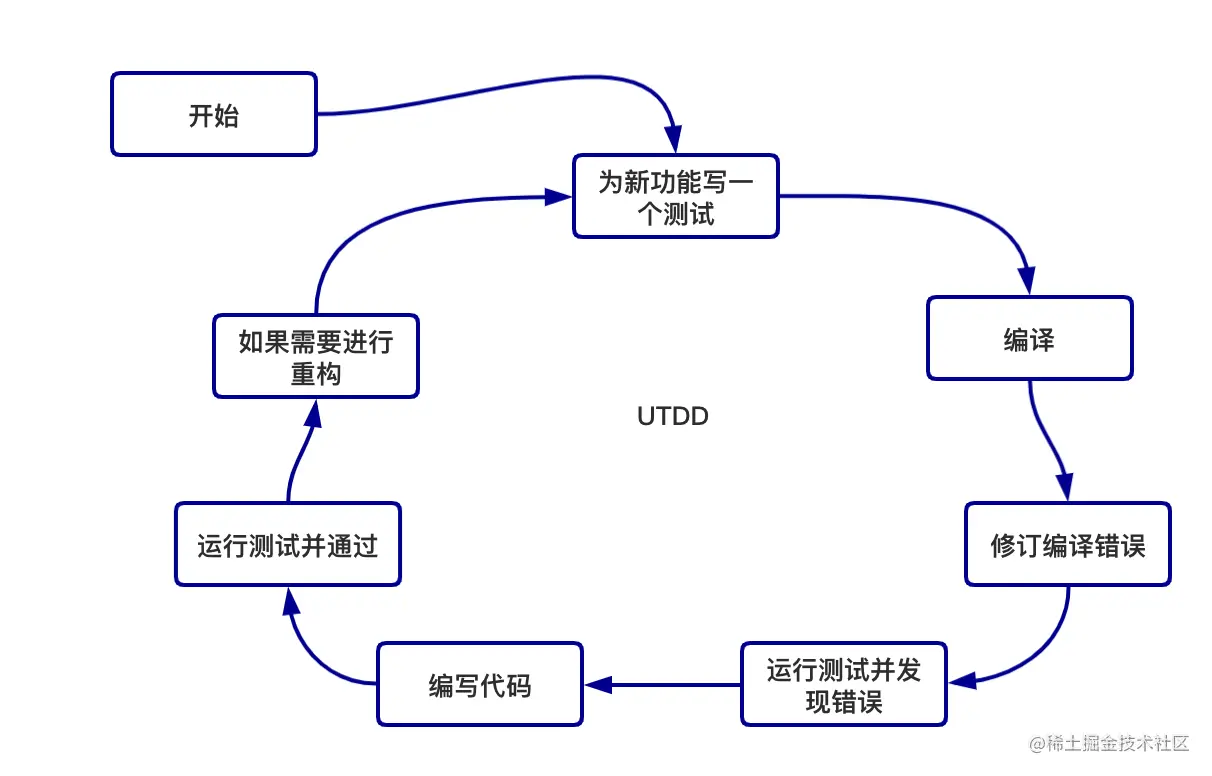 UTDD更主要的是强调一种开发意识,在打算添加新功能实,先不要着急撸代码, 而是将各种条件、使用场景等想清楚,为待撸的代码先写好测试脚本。然后,利用集成开发环境或相应的测试工具框架来执行这段测试用例,结果自然是不通过的。利用没有通过测试的错误新消息反馈,了解到代码没有通过测试用例的原因,有针对性地逐步添加代码。最基本要求是:先写好测试脚本(代码),然后在写代码并通过测试。先写测试类,再写产品类。