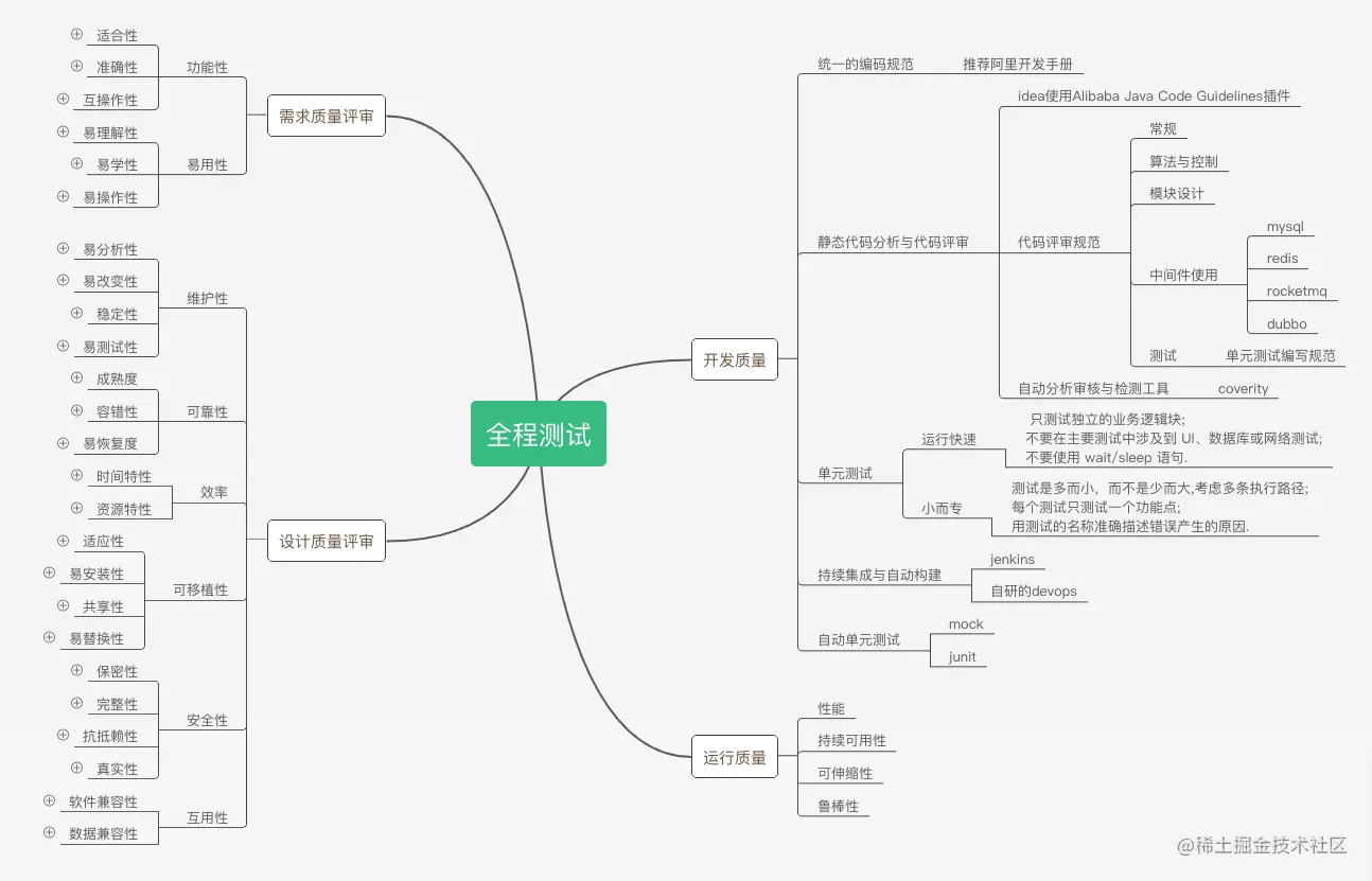 目前我们整个研发迭代质量的把控按照质量模型划分为需求质量评审/设计质量评审/开发质量/运行质量四个环节,需求阶段质量评审主要关注需求的功能性和易用性,设计质量评审主要关注维护性、可靠性、效率、可移植性、安全性、互联性,在开发阶段主要关注编码规范、代码评审、单元测试、持续集成等,上线发布后主要关心性能、持续可用性、可持续性、鲁棒性等。