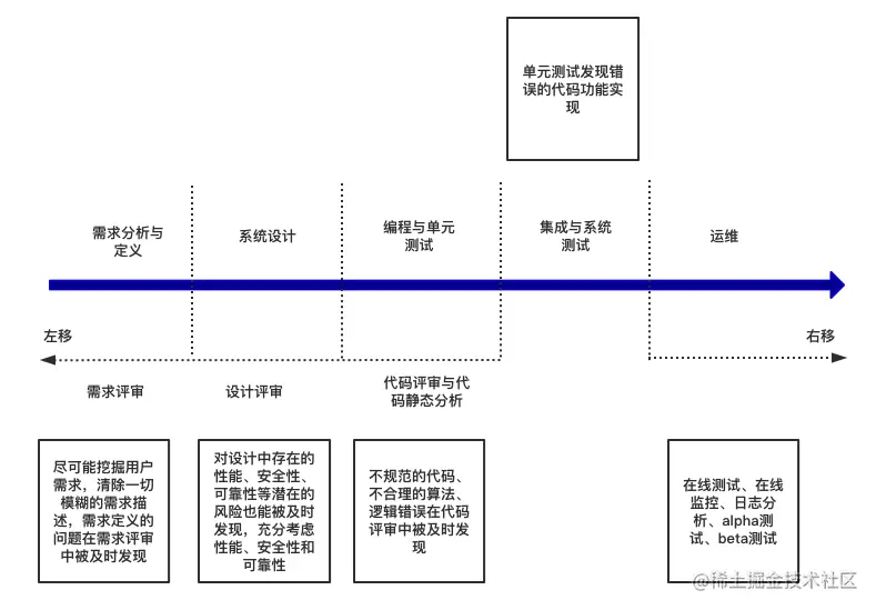 _**测试左移: 将测试计划与设计提前进行,以及开展需求评审、设计评审、代码评审等;
