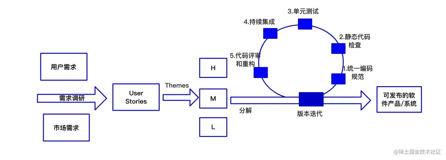 我们现在大部分的软件产品/系统都遵循敏捷开发模型, 一个好的研发模型是决定软件产品质量的重要前提,产品需求经过调研后输入到迭代中形成用户故事实例,并经过分解后形成任务列表,在版本迭代中经过编码规范、代码审核检查、单元测试、持续集成等等环节后完成一个产品/系统的发布。