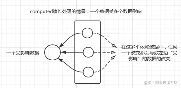 computed的地方,尽可能使用computed。 computed是计算一个新的属性,并将该属性挂载到vm上,而watch是监听已经存在且已挂载VM上的数据,所以用watch同样可以监听computed计算属性的变化。- 使用方式上 计算属性是依据响应式属性得出的计算属性,使用时需要调用,且不加(),会缓存数据,在响应式属性更新时,计算属性也更新。 侦听器不需要调用,会在侦听属性发生变化时,自动调用。