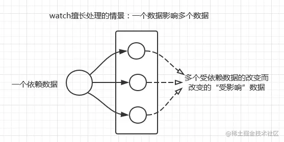 watch一般用于监控路由、input输入框的值特殊处理等等,它比较适合的场景是一个数据影响多个数据。