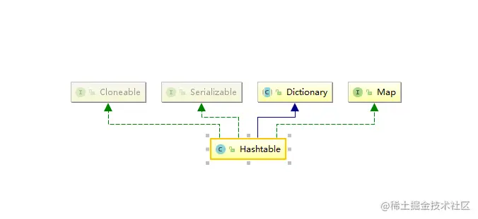 Hashtable继承于Dictionary类,实现了Map接口。Map是"key-value键值对"接口,Dictionary是声明了操作"键值对"函数接口的抽象类。