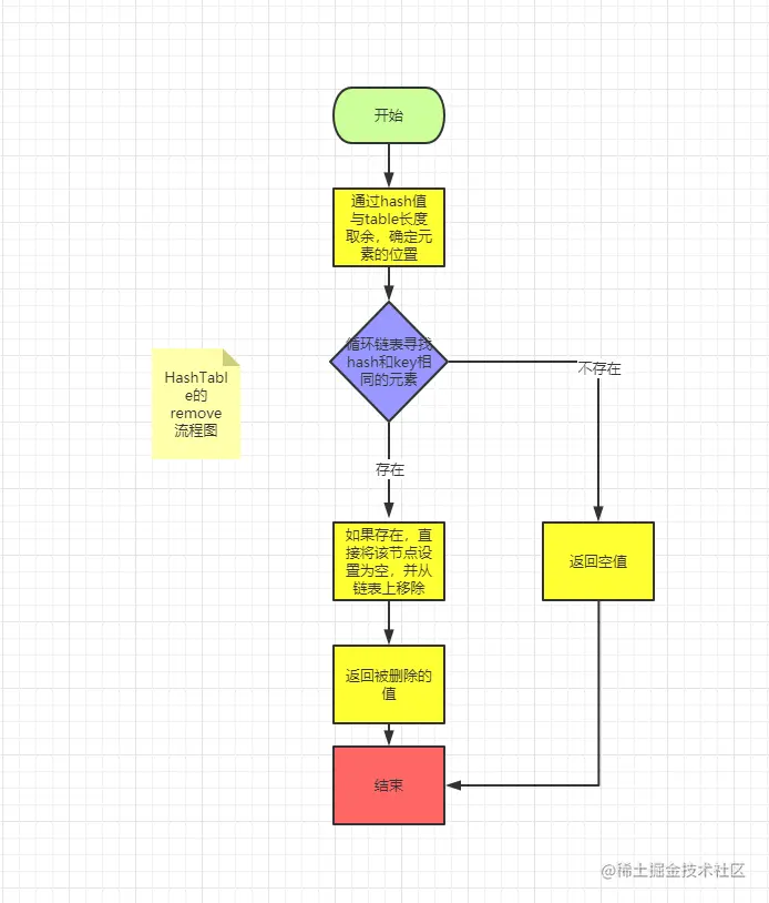 通过key计算阶段存储的下标,根据下标获取对应的链表,循环,寻找hash和key都相等的键,如果存在,就将该节点设置为空,并在链表中删除,返回删除的值。