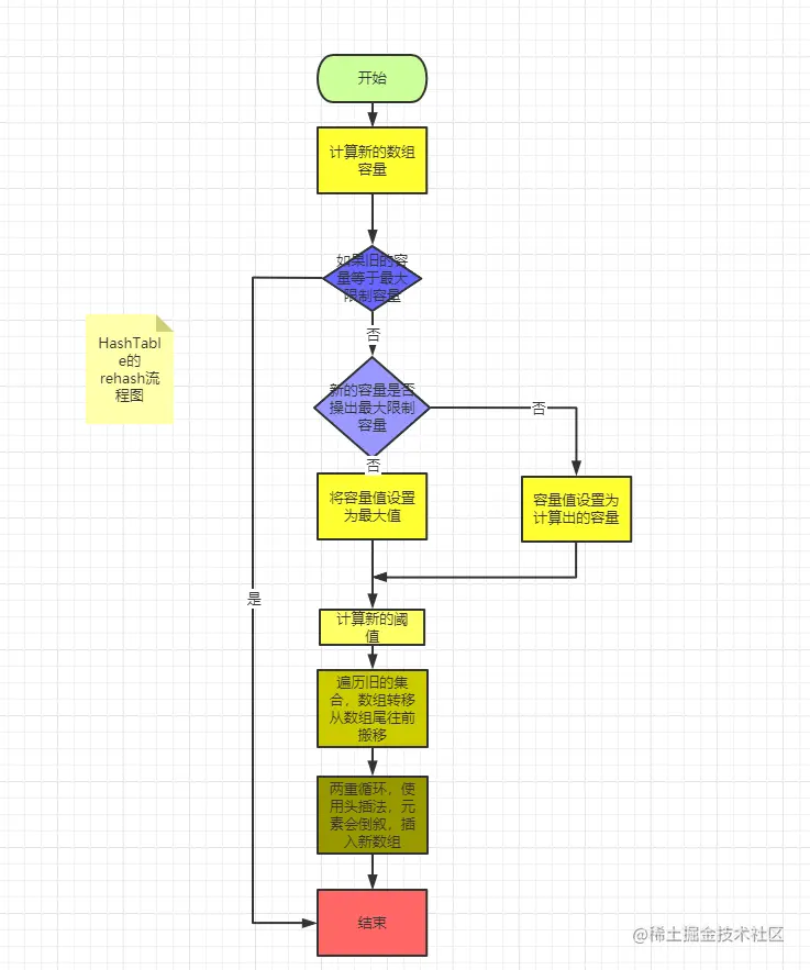 它先去从后向前的遍历数组,然后第二层循环去遍历数组中每个对象链表,重新计算链表中每一个节点的位置,这样两层循环下来,各个节点的位置就调整好了,容器容量也扩展