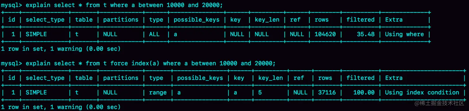 而如果选择扫描10万行,是直接在主键索引上扫描的,没有额外的代价。 优化器会估算这两个选择的代价,从结果看来,优化器认为直接扫描主键索引更快。当然,从执行时间看来,这个选择并不是最优的。