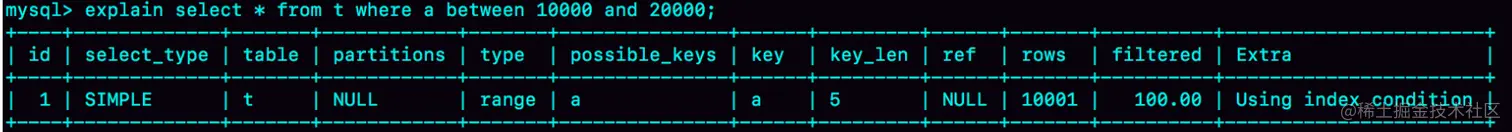 | explain select * from t where a between 10000 and 20000; | |