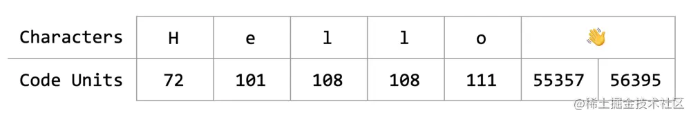 这张图显示的是字符串 "你好",最后是一个挥手的表情符号,是UTF -16编码单位。这个表情符号需要两个单位。 在字符串 "Hello👋"中,除了挥手表情符号👋外,每个用户可感知的字符都被映射到一个代码单位。这种映射的一个直接后果就是混淆了这个字符串的长度。下面这行代码的输出是6还是7?