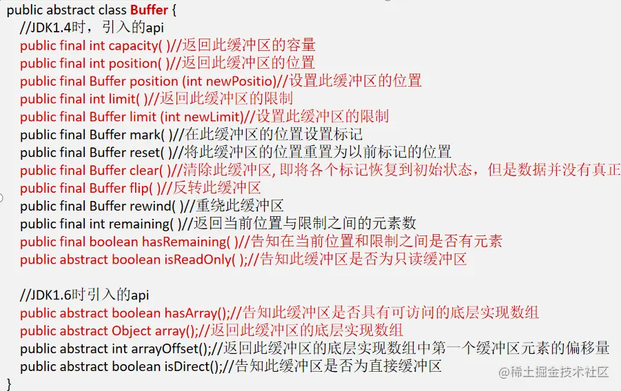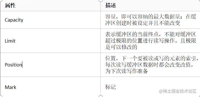 Buffer类定义了所有的缓冲区都具有的四个属性来提供关于其所包含的数据元素的信息: