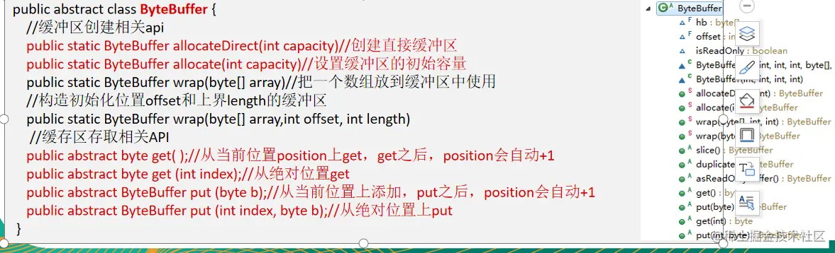 - 从前面可以看出对于 Java 中的基本数据类型(boolean除外),都有一个 Buffer 类型与之相对应,最常用的自然是ByteBuffer 类(二进制数据),该类的主要方法如下: