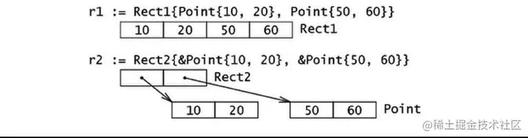 Go 语言中,结构体和它所包含的数据在内存中是以连续块的形式存在的,即使结构体中嵌套有其他的结构体,这在性能上带来了很大的优势。不像 Java 中的引用类型,一个对象和它里面包含的对象可能会在不同的内存空间中,这点和 Go 语言中的指针很像。下面的例子清晰地说明了这些情况: