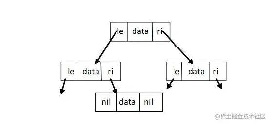 二叉树中每个节点最多能链接至两个节点:左节点(le)和右节点(ri),这两个节点本身又可以有左右节点,依次类推。树的顶层节点叫根节点(root),底层没有子节点的节点叫叶子节点(leaves),叶子节点的 le 和 ri 指针为 nil 值。在 Go 中可以如下定义二叉树: