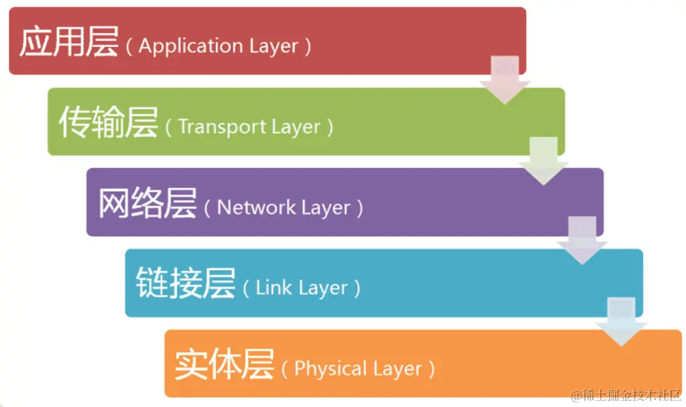 如上图所示,最底下的一层叫做"实体层"(Physical Layer),最上面的一层叫做"应用层"(Application Layer),中间的三层(自下而上)分别是"链接层"(Link Layer)、"网络层"(Network Layer)和"传输层"(Transport Layer)。越下面的层,越靠近硬件;越上面的层,越靠近用户。