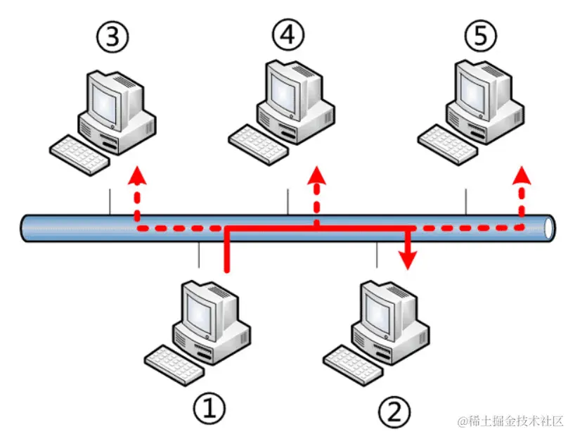 上图中,1号计算机向2号计算机发送一个数据包,同一个子网络的3号、4号、5号计算机都会收到这个包。它们读取这个包的"标头",找到接收方的MAC地址,然后与自身的MAC地址相比较,如果两者相同,就接受这个包,做进一步处理,否则就丢弃这个包。这种发送方式就叫做"广播"(broadcasting)。