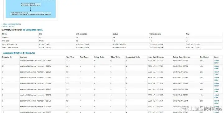 查询快的表,查询时总共有68个任务,任务分配比如均匀,平均7~9s左右,而查询慢的表,查询时总共1160个任务,平均也是9s左右。如下图所示: