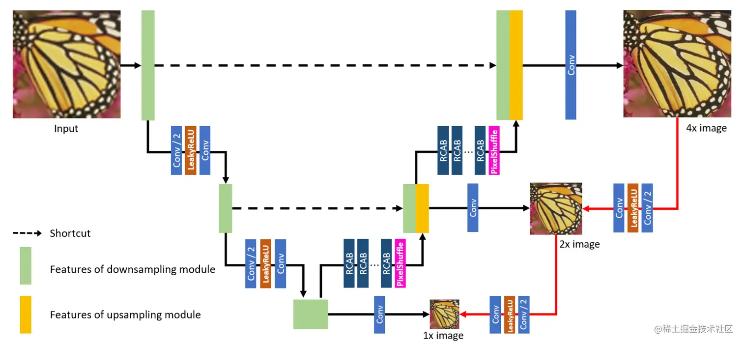 - 使用成对的低分辨率-高分辨率图像可以解决上述问题。 但由于低分辨率图像是由高分辨率下采样获得的,而在真实环境的测试中,输入的图像的下采样方法是未知的,因此可能会带来适应性的问题。