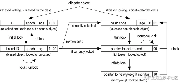如果对象是刚创建的,那么是什么状态呢。在之前的输出可以找到,标志这baised_lock和lock是001,表示的是unlocked,也就是解锁状态。但是我们在文档Synchronization and Object Locking上的图可以看出,新生的对象状态会有两种可能。