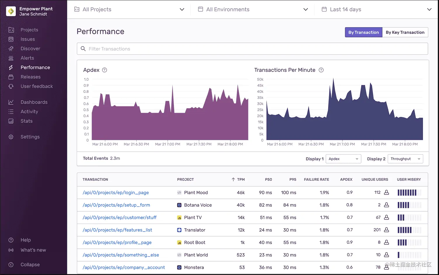 性能监视主页是主视图,您可以在其中搜索或浏览事务数据。按搜索条件筛选或从表中可排序的事务列表中选择。一旦某个感兴趣的事务被根除,您可以通过单击该事务以查看其摘要视图来进行进一步的调查。