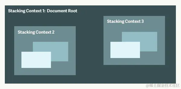 如图所示,层叠上下文 1 指的就是文档根部,而层叠上下文 2 和 3 位于 1 的某个层叠等级中。此外,这两个层叠上下文各自会包含新的层叠等级。