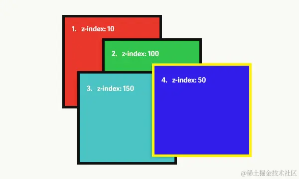 div { width: 200px; height: 200px; padding: 20px; } .one, .two, .three, .four { position: absolute; } .one { background: #f00; outline: 5px solid #000; top: 100px; left: 200px; z-index: 10; } .two { background: #0f0; outline: 5px solid #000; top: 50px; left: 75px; z-index: 100; } .three { background: #0ff; outline: 5px solid #000; top: 125px; left: 25px; z-index: 150; } .four { background: #00f; outline: 5px solid #ff0; top: 200px; left: 350px; z-index: 50; }