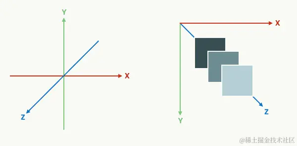 由于屏幕是一块二维平面,我们实际上并没有真的看到 z 轴,更多的是通过透视的形式。具体地说,多个元素共享同一块二维平面时,有的元素在顶部,有的元素在底部,我们由此感受到了 z 轴的存在。