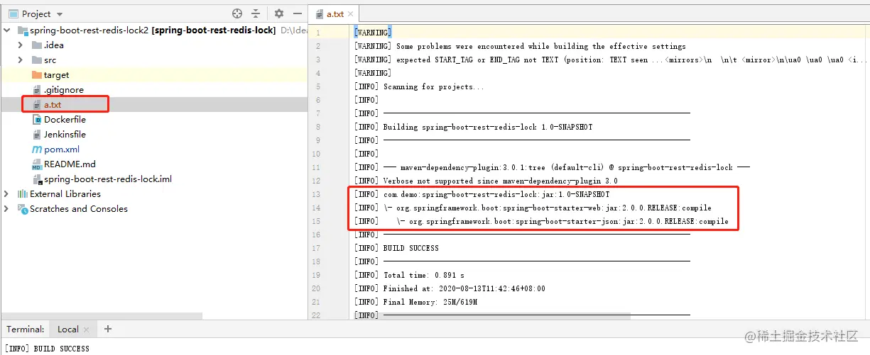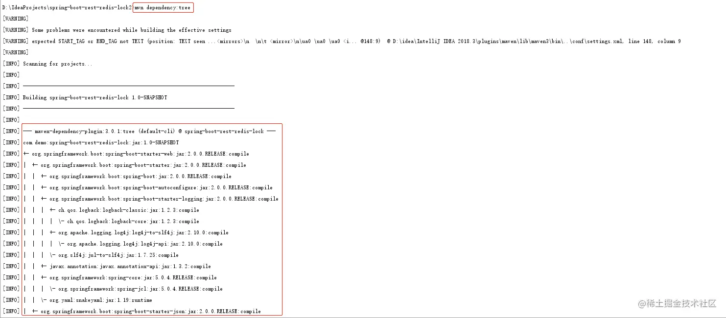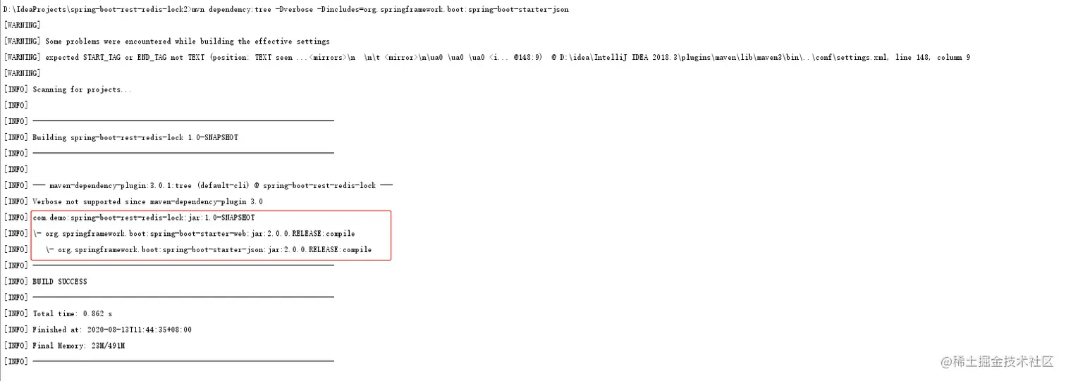 也可以把结果输出到一个文件里打开查看: mvn dependency:tree -Dverbose -Dincludes=org.springframework.boot:spring-boot-starter-json > a.txt