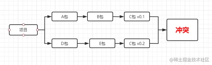 答案是保留v0.1,如果距离一样,那么谁先声明就先保留谁,A包比D包先声明,所以保留A包的引用依赖。