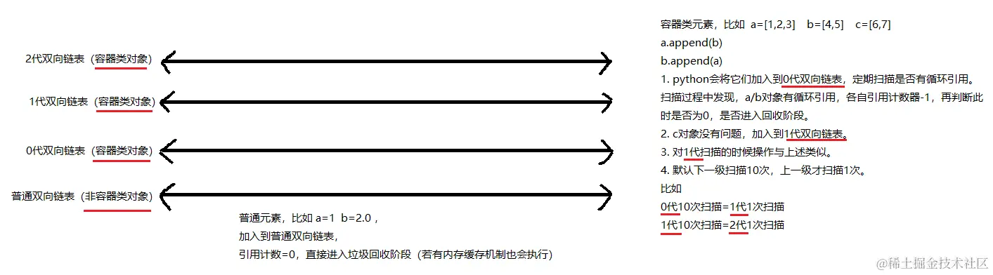 - 针对那些容器类的对象,Python创建的时候会把它们单独加到一个新的双向链表里,定期扫描,检查是否有循环引用,如果有则各自-1,如果-1之后等于0,就进入回收阶段(若有驻留机制也会执行)