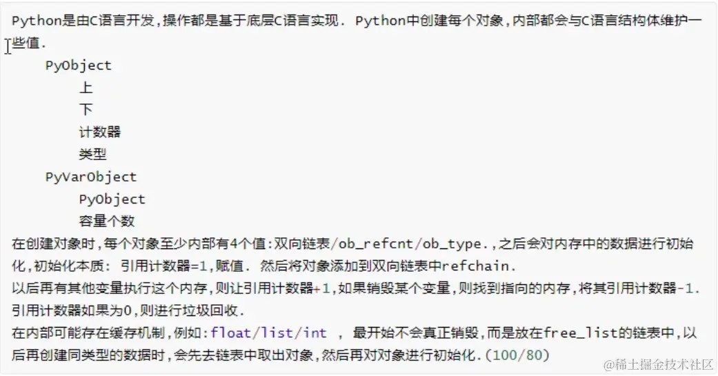 - 比如float对象就有个最多可存100个空间的free_list,list对象则有个最多可存80的free_list,