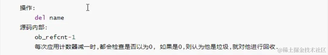 a=[1,2] b=[3,4] a.appen(b) #b的引用计数=2 b=append(a) #a的引用计数=2 del a del b;此时a/b引用计数=1,未被回收,始终存在于内存中。(内存泄漏) -