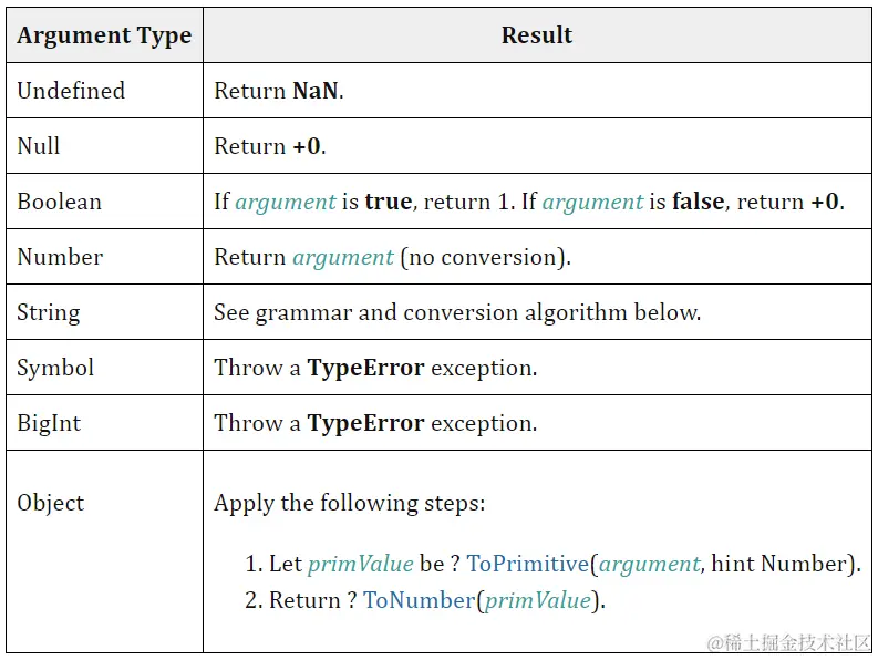 []对应"",["1"]对应"1",["1", "2"]对应"1,2"。 - 返回 ToNumber(primValue),即 ToNumber("")、ToNumber("1")、ToNumber("1,2"),得到结果为 0、1、NaN。